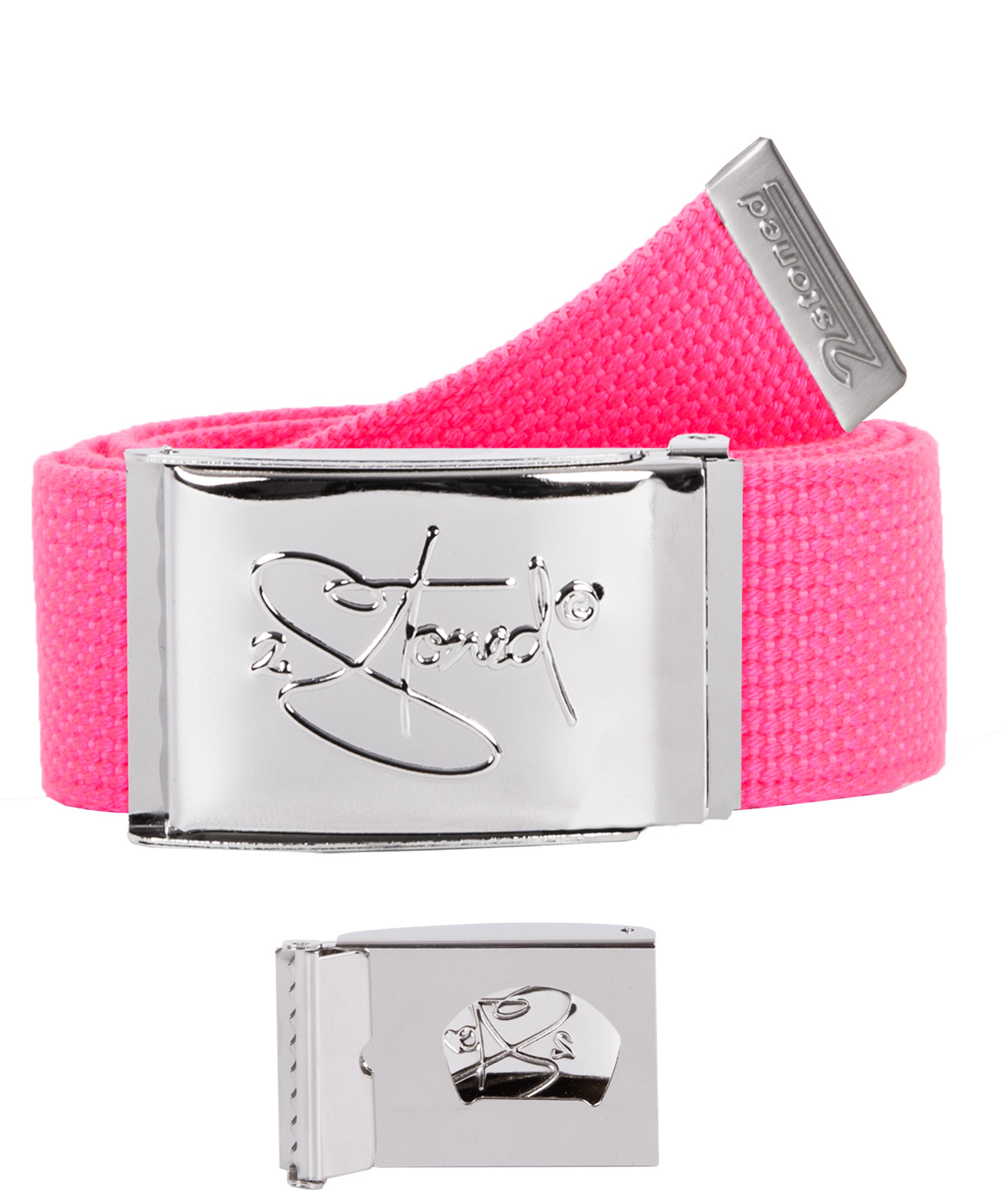 Ein einfarbiger Gürtel im Classic Chrome Style mit Chromschnalle inkl. Flaschenöffner und geprägtem Logo - Stoffgürtel Original 2-stoned wear